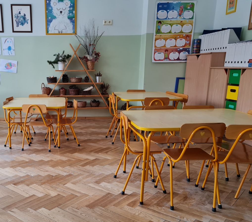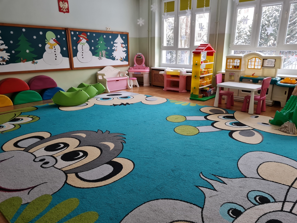 Z uwagi na bardzo rozbudowany układ architektoniczny budynku. Każda grupa w naszym przedszkolu ma do swojej wyłącznej dyspozycji szatnię, łazienkę i toalety, salę zabaw, salę dydaktyczną - w której spożywane są również posiłki. Sale wyposażone są w nowoczesny system wideofonów. Dzięki kamerom nauczycielki mają możliwość bez opuszczania sal, rozpoznać osobę odbierającą dziecko z przedszkola. Na pierwszym piętrze w sali odbywają się również zajęcia umuzykalniające, lekcje języka angielskiego, lekcje tańca, bale okolicznościowe, teatrzyki, koncerty muzyki poważnej i przedszkolne uroczystości.W przedszkolu mamy też oddzielny pokój do pracy indywidualnej terapeutów z dziećmi. Odbywają się tam zajęcia z logopedii oraz spotkania z psychologiem.